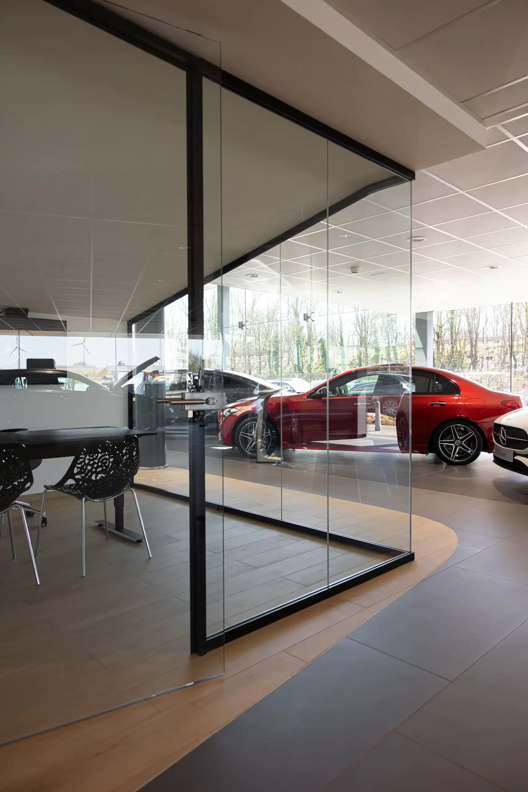 Le revêtement de sol est également accrocheur. Dans les showrooms, il y a d’énormes surfaces de sol, dans des couleurs spécifiques et avec des formes arrondies. Les traiter correctement selon les exigences esthétiques strictes de Mercedes-Benz était un véritable défi, mais a été parfaitement réussi.